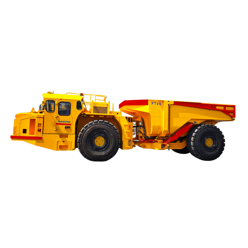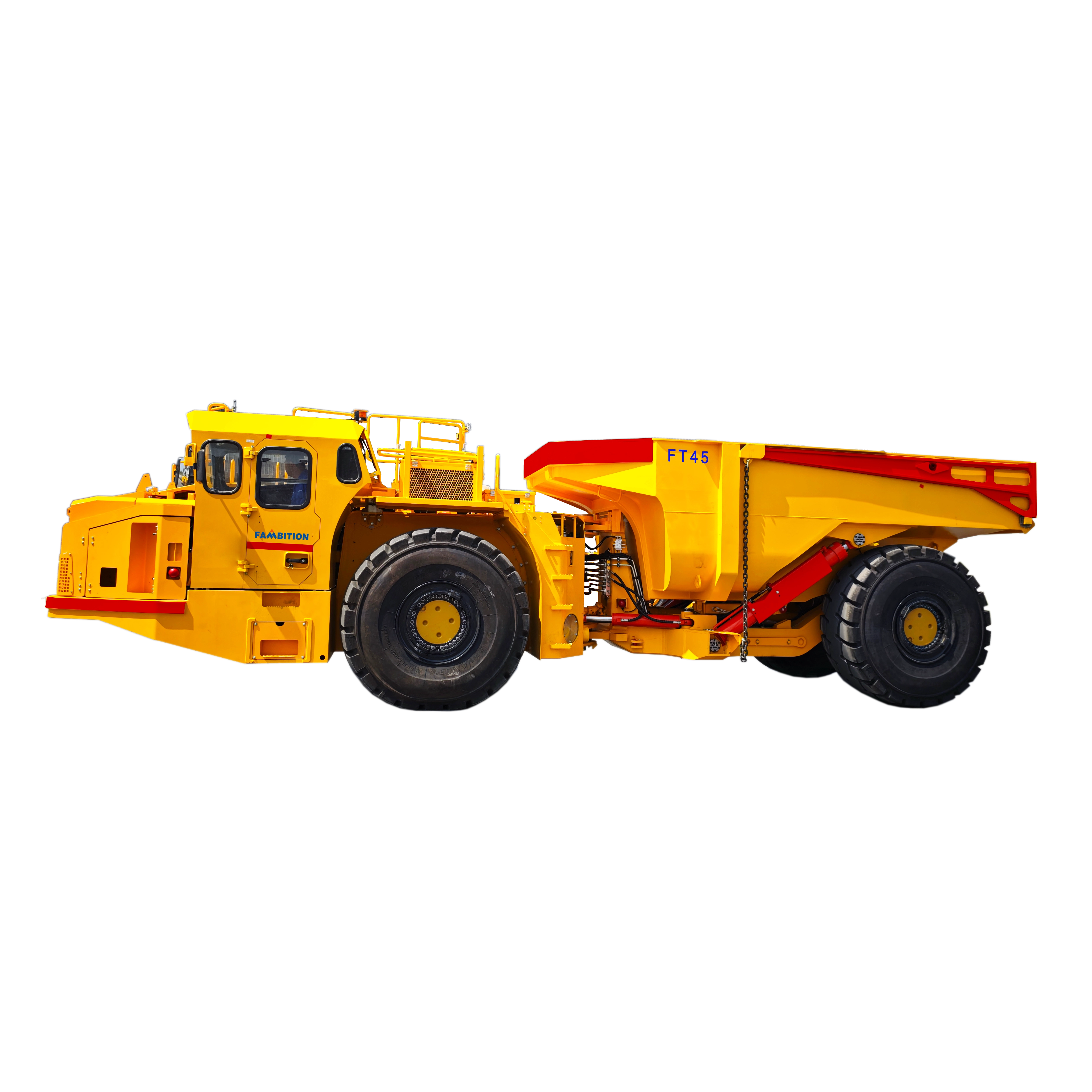 FT45地下铰接式运矿卡车专为国内外大型地下非煤矿山或隧道施工设计,标准厢斗容积22m³, 额定载重45吨,适配巷道最佳尺寸(宽*高)≥5*4m,环境温度为-25 °C 至+50 °C。