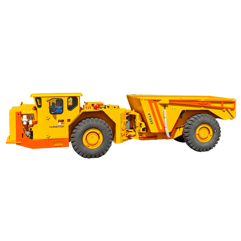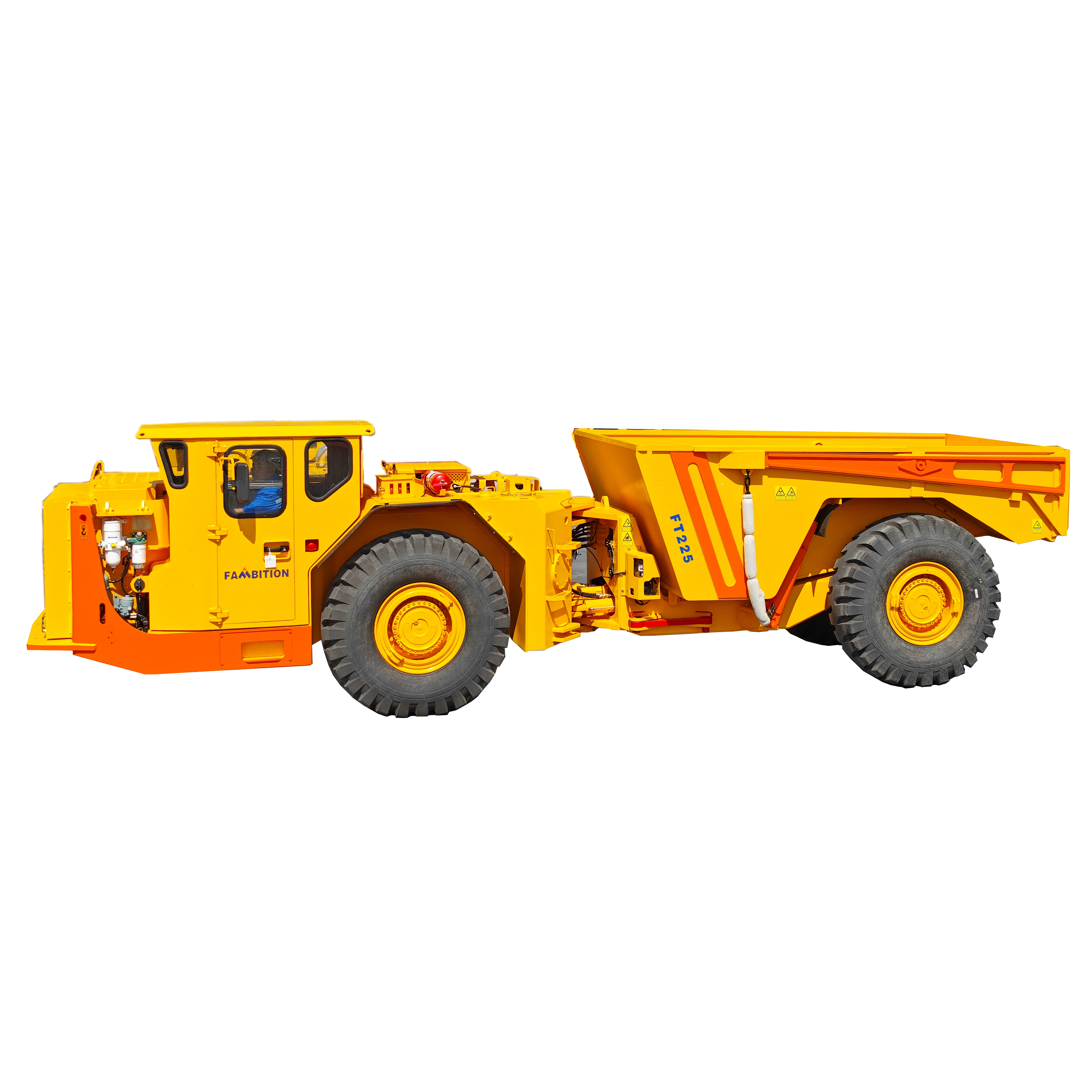 FT225 地下铰接式运矿卡车专为国内外中、小型地下非煤矿山或隧道施工设计,标准厢斗容积10m³, 额定载重22吨,适配巷道最佳尺寸(宽*高)≥3.6m*3m, 环境温度为-25°至+50°,采用瑞典Volvo发动机,原装Volvo尾气后处理器,尾气后处理方式:DOC+DPF+SCR+ASC, 排放标准达到国四或Euro Stage V阶段标准。