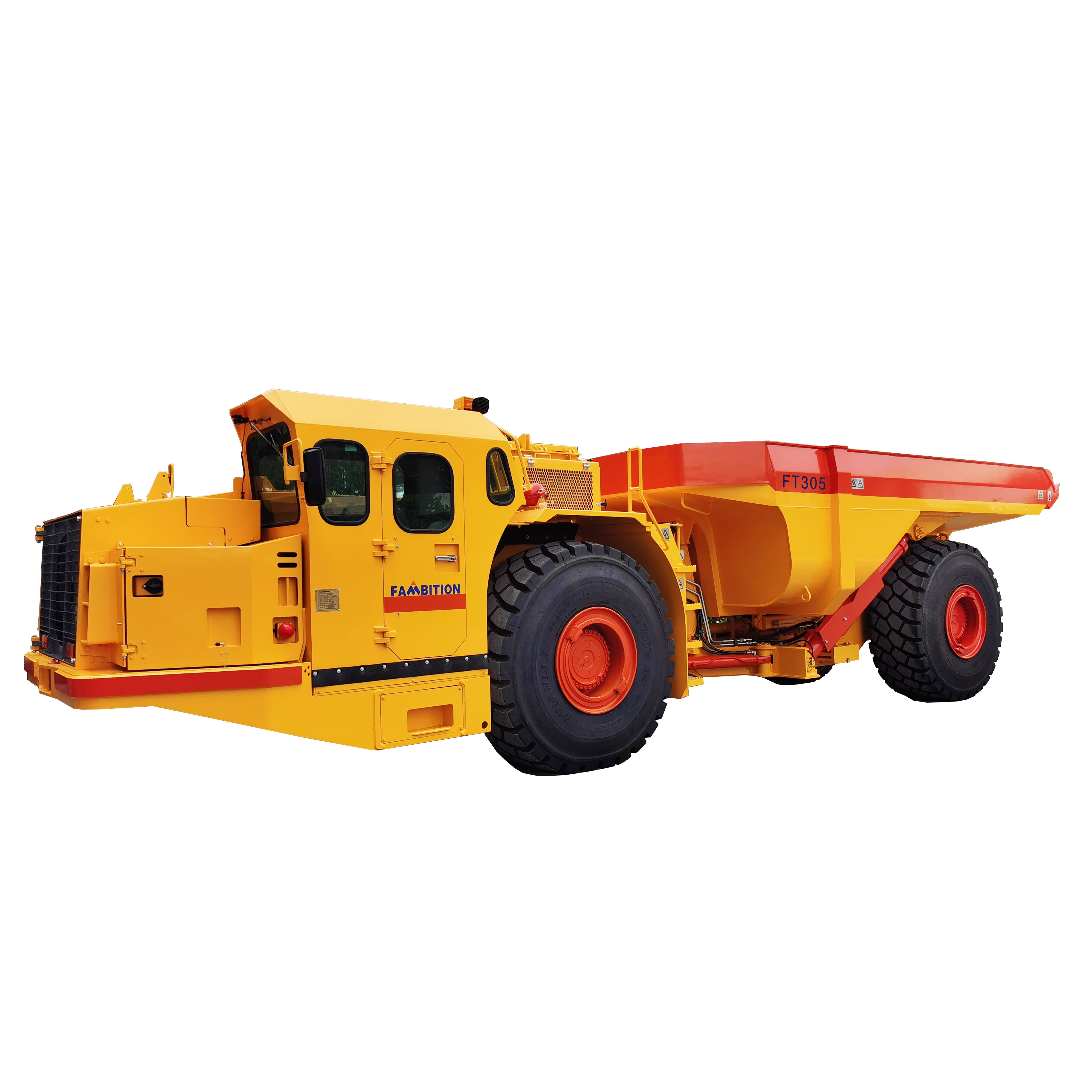 FT305地下铰接式运矿卡车专为国内外中、大型地下非煤矿山或隧道施工设计,标准厢斗容积16m³, 额定载 重30吨,适配巷道最佳尺寸(宽*高)≥4m*3.5m, 环境温度为-25°至+50°