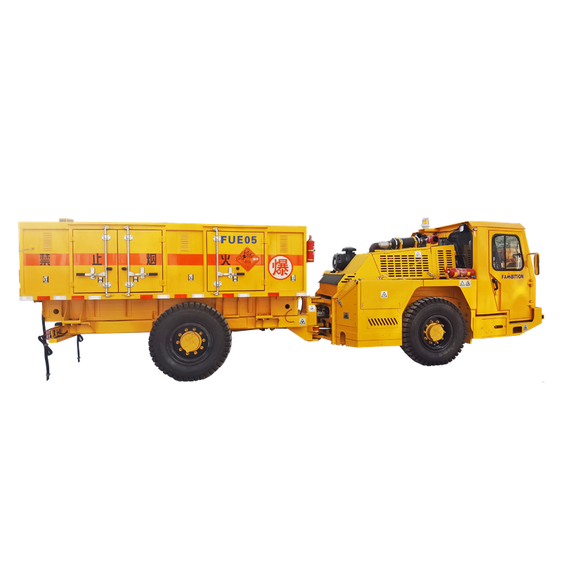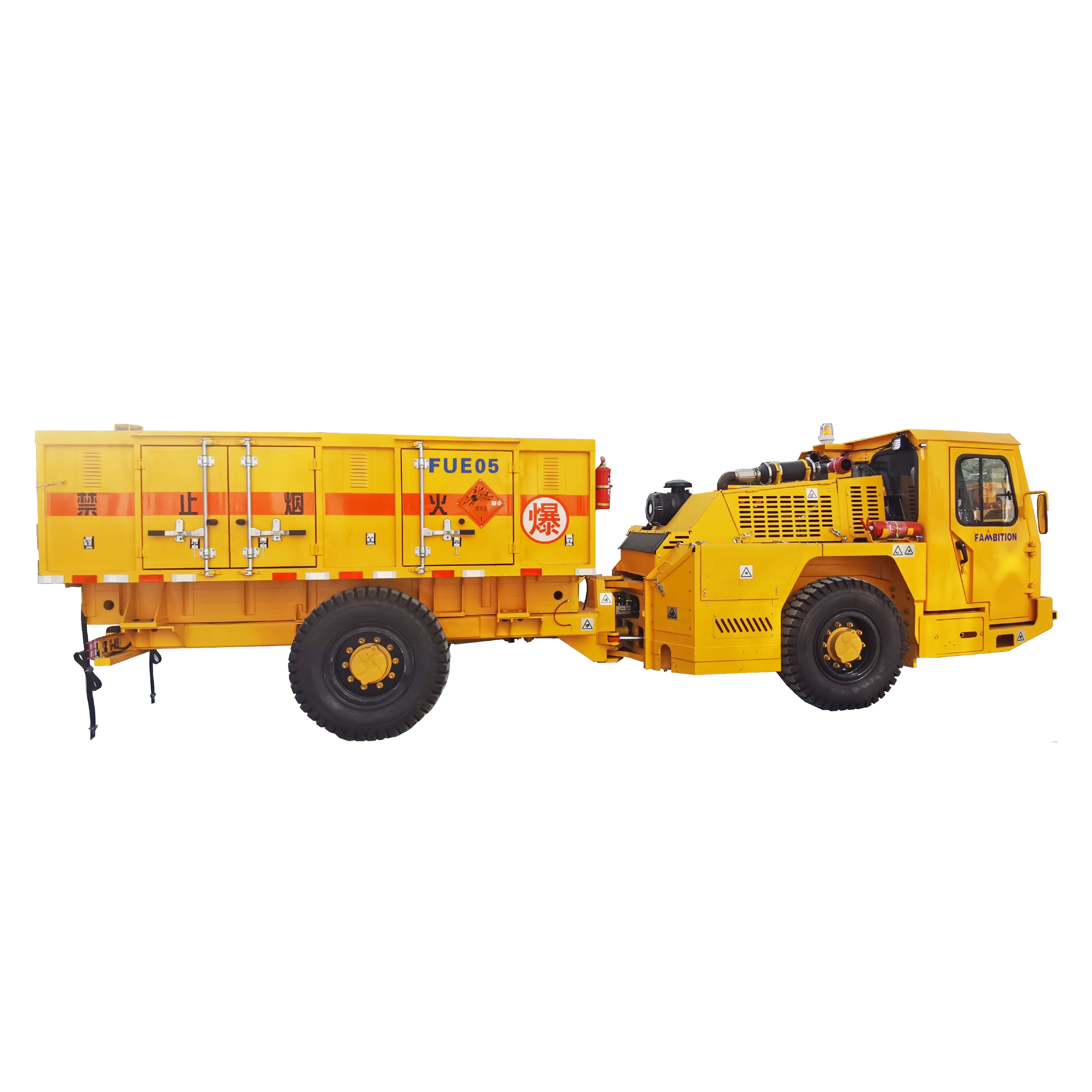 FUE05是一款额定载荷4.5吨无轨爆破器材运输车,整车采用中央铰接式车架,采用弹簧制动、液压松闸安全型制动器,水冷式涡轮增压(国IV) 发动机,低排放、低污染、让井下作业更环保,驾驶室满足全新的防落石、防侧翻安全标准驾驶室设计视野开阔、驾驶舒适、安全、方便。仅用一台底盘搭配不同功能的车厢可完成多种工作,只需两三分钟之内,可在任意地点、时间更换车厢,操纵者无需要离开座椅可完成装卸和卸载车厢。