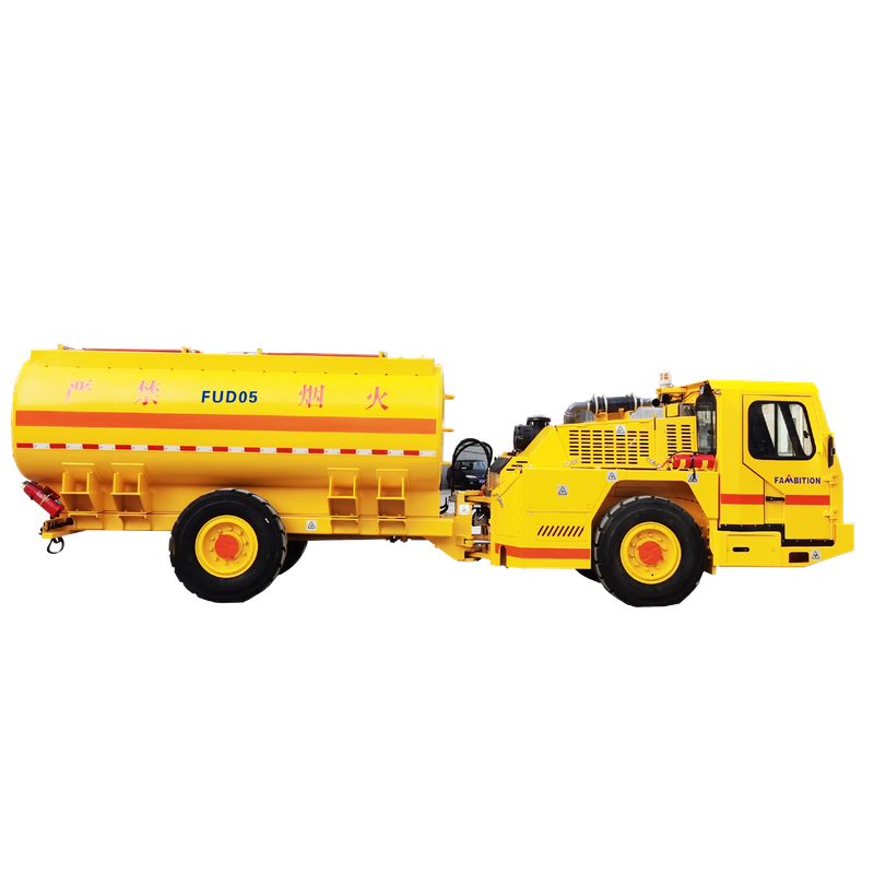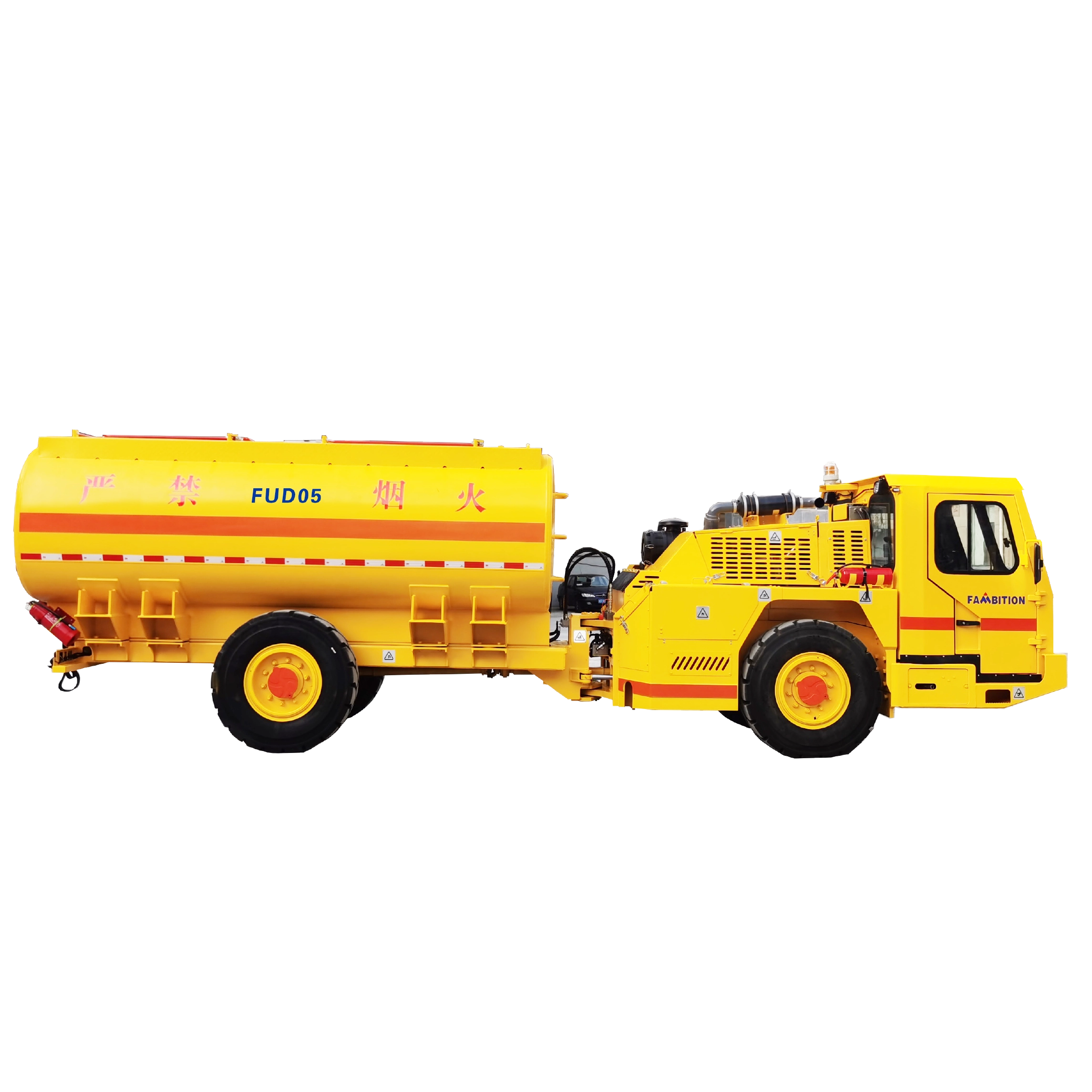 FUD05 是一款5000L无轨油料运输车,整车采用中央铰接式车架,采用弹簧制动、液压释放安全型制动器,水冷式涡轮增压(国IV)发动机,低排放、低污染、让井下作业更环保,驾驶室满足全新的防落石、防侧翻安全标准驾驶室,设计视野开阔、驾驶舒适、安全、方便。仅用一台底盘搭配不同功能的车厢可完成多种工作,只需两三分钟之内,可 在任意地点、时间更换车厢,操纵者无需要离开座椅可完成装卸和卸载车厢。