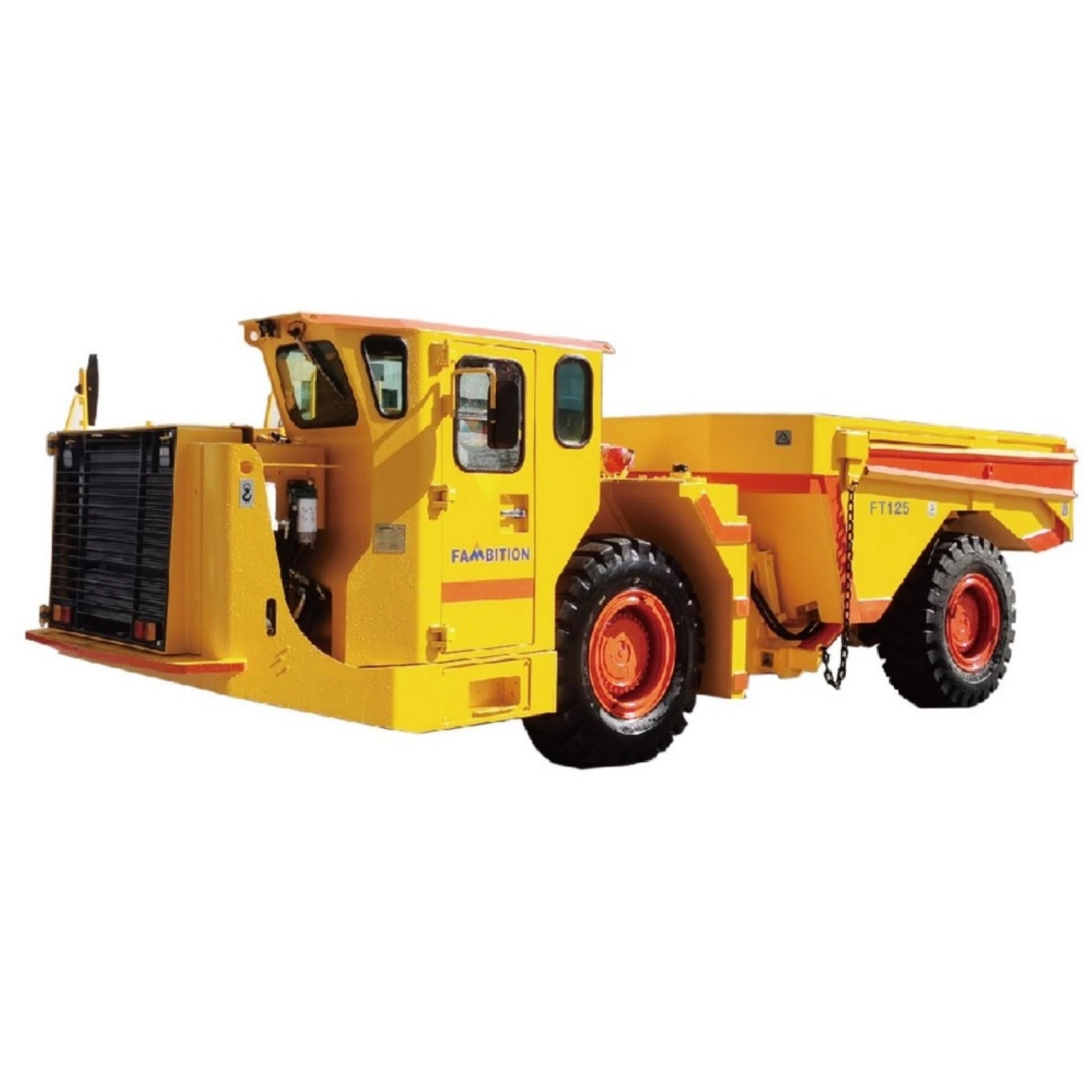 FT125地下铰接式运矿卡车专为国内外中小型地下非煤矿山或隧道施工设计,标准厢斗容积6m³,,额定载重12吨,环境温度为-25°至+50°采用CUMMINS电喷水冷发动机,尾气后处理方式:DOC+DPF+SCR, 排放标准达到国四标准。